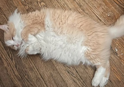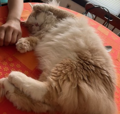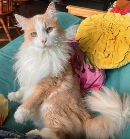 Toddy is the perfect gentleman! He's very social and LOVES cuddles, happily jumping into any lap or curling up on any couch, purring the whole time! He has a hilarious, sassy side: He stops to admire his reflection in mirrors, he loves to snuggle with purses and handbags, and he will give you a gentle tap on the arm with his paw when he feels he isn't being pet enough. He's very vocal with an adorable meow, accompanying you on your adventures from room to room with his bushy tail in the air!